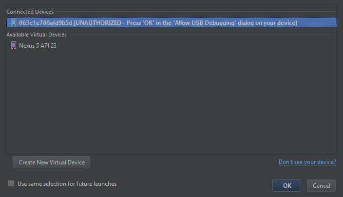 - Panel baru akan muncul (jika Anda memakai Android Studio lama). Perhatikan pada Connected Device, tertulis UNAUTHORIZED.